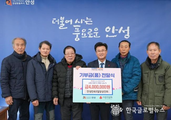 (한국글로벌뉴스 - 박소연 기자) 안성시는 1월 8일 민속오일장 상인회로부터 400만 원의 성금을 전달받았다고 밝혔다. 전달식에는 상인회 임원진과 시 관계자가 참석한 가운데 진행됐다.