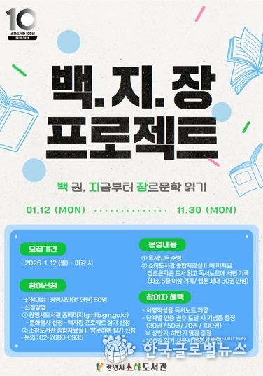 (한국글로벌뉴스 - 박소연 기자) 광명시 소하도서관은 오는 12일부터 장르문학 도서 100권 읽기 챌린지인 ‘백.지.장 프로젝트’ 참여자를 모집한다.