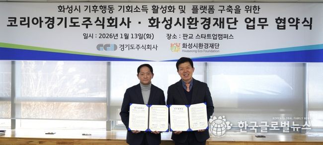 (한국글로벌뉴스 - 박소연 기자) 경기도주식회사는 13일 경기도 성남시 판교 스타트업캠퍼스에서 화성시환경재단과 ‘기후행동 기회소득 활성화 및 화성시 플랫폼 구축을 위한 업무협약’을 체결했다.