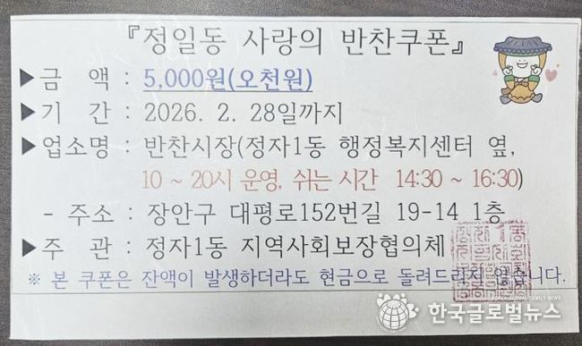 (한국글로벌뉴스 - 박소연 기자) 수원시 장안구 정자1동 지역사회보장협의체는 금년부터 관내 취약계층 가구를 대상으로 매월 5가구에 2만원 상당의 반찬쿠폰을 지급하는 사업을 시작한다고 지난 13일 밝혔다.