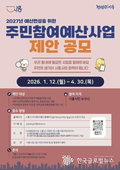 (한국글로벌뉴스 - 박소연 기자) 시흥시는 오는 4월 30일까지 주민들이 직접 사업을 제안하는 ‘시흥시 주민참여예산 제안’을 신청받는다.