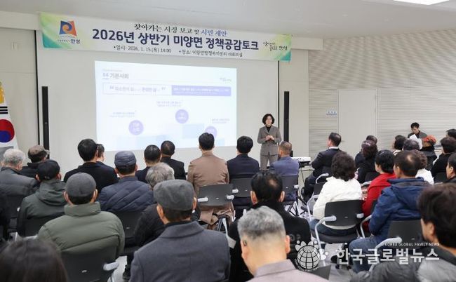 (한국글로벌뉴스 - 박소연 기자) 안성시 미양면은 지난 1월 15일, 미양면행정복지센터 대회의실에서 주민 120여 명이 참석한 가운데 ‘2026년 상반기 미양면 정책공감토크’를 성황리에 개최했다.