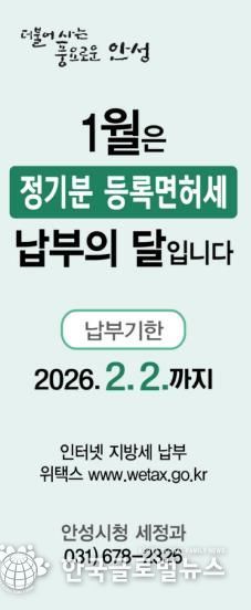 안성시 관계자는 “등록면허세 납부기한은 2월 2일까지로, 납기 마지막 날에는 민원인이 몰려 혼잡하거나 온라인 접속이 지연될 수 있으므로 조기 납부를 부탁드린다”고 당부했다.