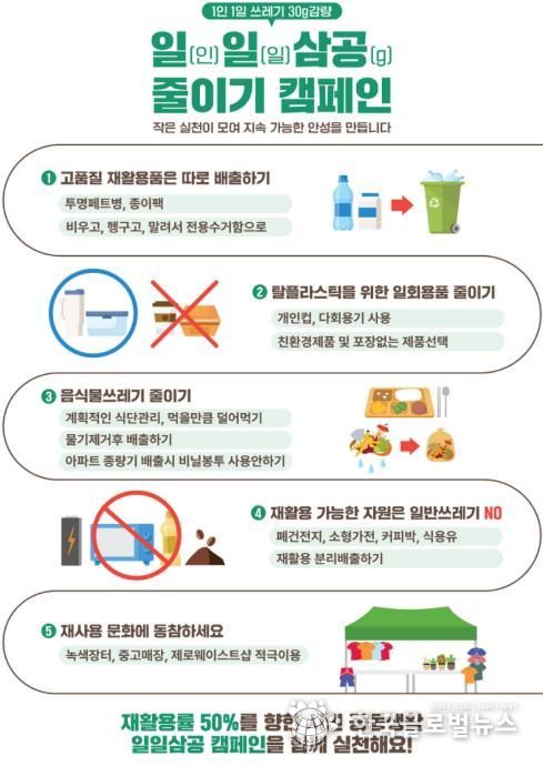 (한국글로벌뉴스 - 박소연 기자) 안성시는 시민의 자발적인 실천을 통해 재활용률을 높이고 생활쓰레기 발생량을 줄이기 위한 ‘1인 1일 쓰레기 30그램 줄이기(일일삼공) 캠페인’을 적극 추진하고 있다고 밝혔다.