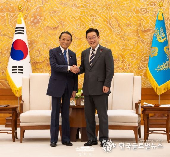 (한국글로벌뉴스 - 박소연 기자) 이재명 대통령은 16일 16시부터 약 30분간 '서울-도쿄 포럼' 참석차 방한한 아소 다로(麻生 太郎) 전 일본 총리를 접견하고, 이번 주 진행된 나라(奈良) 방문(1.13.-14.)과 한일 정상회담 결과 등에 대해 이야기를 나누었다.