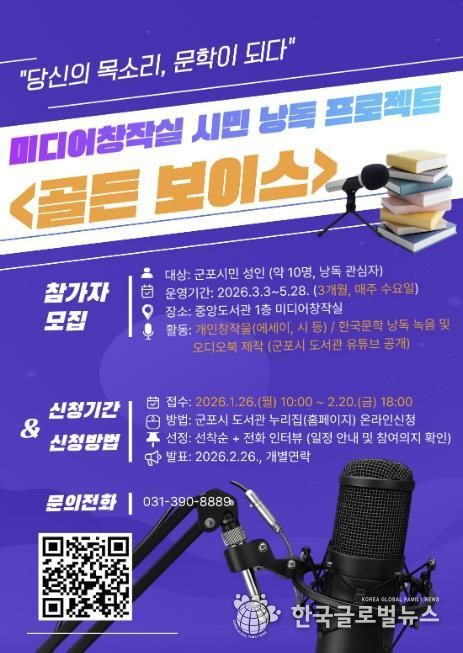 (한국글로벌뉴스 - 박소연 기자) 군포시 중앙도서관은 시민이 직접 참여하는 낭독 콘텐츠 제작을 통해 공공 문화콘텐츠를 확산하고, 시민의 창작 경험을 지원하기 위해 미디어창작실 시민 낭독 프로젝트 '골든 보이스'를 운영한다.