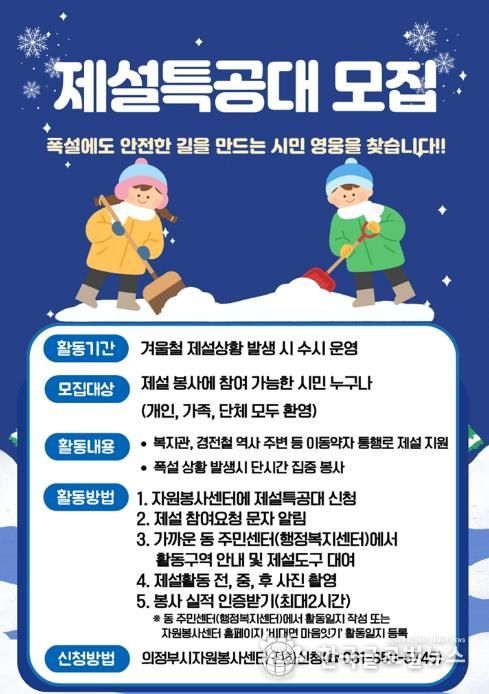 (한국글로벌뉴스 - 박소연 기자) 의정부시는 겨울철 폭설로 인한 시민 불편을 최소화하고 안전한 보행환경을 조성하기 위해 ‘제설특공대’를 모집한다.