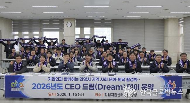 (한국글로벌뉴스 - 박소연 기자) 안양산업진흥원은 15일 오후 3시30분 안양창업지원센터 강당에서 관내 기업인 150여 명을 대상으로 지역사회 문화·체육 활성화를 위한 ‘2026 CEO 드림(Dream) 데이’를 열었다.