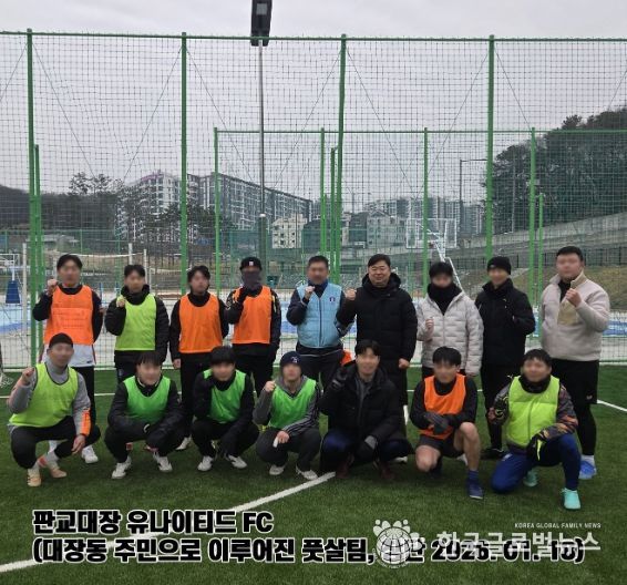 (한국글로벌뉴스 - 박소연 기자) 성남시의회 국민의힘 김종환 의원(판교·백현·운중·대장, 예산결산특별위원장)은 1월 18일 오전 8시, 대장동저류지 풋살장에서 열린 판교대장유나이티드 창단식에 참석하여 지역 주민들과 소통했다.