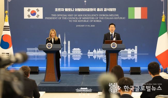 (한국글로벌뉴스 - 박소연 기자) 이재명 대통령은 19일 조르자 멜로니 이탈리아 총리와의 정상회담 뒤 "저와 멜로니 총리는 전략적 동반자 명칭에 부합하는 미래지향적 수준으로 양국 관계를 더욱 발전시켜 나가기로 합의했다"고 밝혔다.