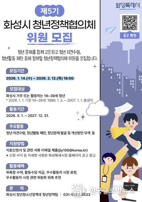 (한국글로벌뉴스 - 박소연 기자) 화성특례시는 다음 달 12일까지 ‘제5기 화성시 청년정책협의체 위원’을 모집한다고 19일 밝혔다.