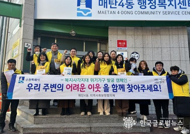 오미숙 매탄4동장은 “매탄4동 행정복지센터는 앞으로도 지속적인 위기가구 발굴 활동을 통해 동절기 복지 안전망 구축에 힘쓰겠다”며 “추운 날씨에도 캠페인에 적극 참여해 주신 지역사회보장협의체 위원님들께 감사드린다”고 밝혔다.