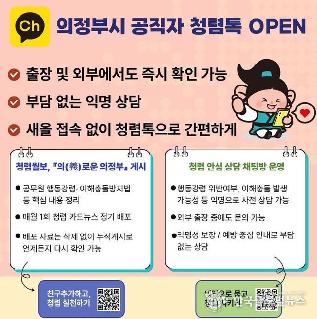(한국글로벌뉴스 - 박소연 기자) 의정부시는 2026년 1월부터 카카오톡 비즈니스 공식 채널을 활용한 ‘의정부시 공직자 청렴톡’을 운영한다.