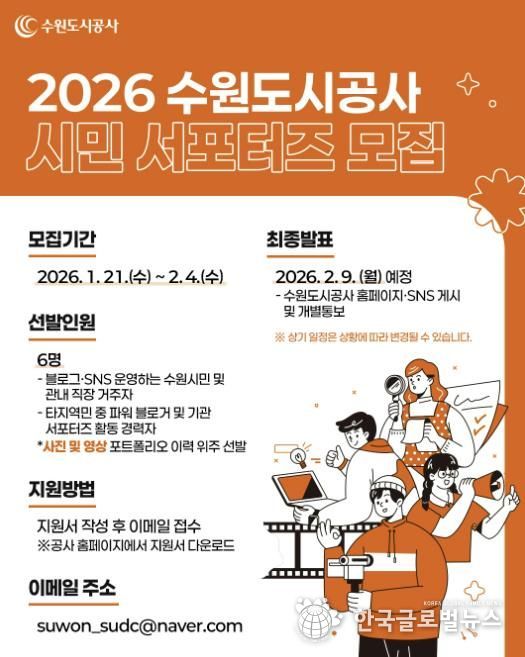 (한국글로벌뉴스 - 박소연 기자) 수원도시공사가 21일부터 다음 달 4일까지 2026년도 제8기 시민 서포터즈를 모집한다.