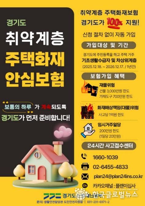 (한국글로벌뉴스 - 박소연 기자) 가평소방서는 화재 피해로부터 취약계층의 일상을 지키기 위해 경기도가 지원하는 ‘취약계층 주택화재 안심보험’ 홍보를 강화한다고 밝혔다. 이번 사업은 도내 취약계층을 대상으로 주택화재 발생 시 재산 피해와 임시 거주에 필요한 비용 등을 보장해 생활 안정을 돕는 제도다.