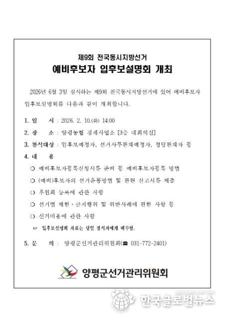 (한국글로벌뉴스 - 박소연 기자) 양평군선거관리위원회는 2월 10일 14:00 양평농협 경제사업소 3층 대회의실에서 2026. 6. 3. 실시하는 제9회 전국동시지방선거와 관련하여 입후보예정자들에게 (예비)후보자등록 및 선거운동방법 등에 관한'예비후보자 입후보설명회'를 개최한다고 밝혔다.