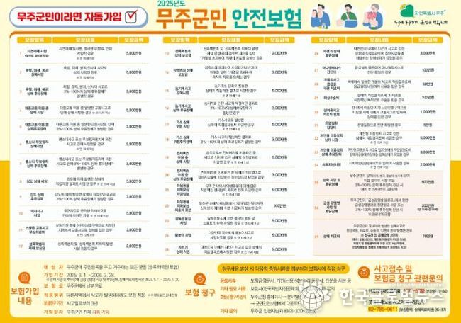 배점옥 무주군청 안전재난과 안전민방위팀장은 “무주군민이면 별도의 가입 절차 없이 자동으로 보험 혜택을 받을 수 있다”라며 “예기치 못한 사고와 재난으로 인해 어려운 상황에 부닥친 군민이 하루빨리 일상으로 복귀할 수 있도록 뒷받침하는 데 최선을 다할 것”이라고 밝혔다.