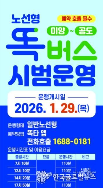 (한국글로벌뉴스 - 박소연 기자) 안성시는 1월 29일부터 미양면과 공도읍을 직접 연결하는 노선형 똑버스를 운행한다.