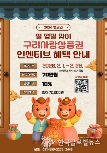 (한국글로벌뉴스 - 박종욱 기자) 구리시는 설 명절을 맞아 지역 내 소비 촉진과 소상공인 매출 증대를 위해 2월 한 달간 구리사랑상품권 특별 인센티브를 10%로 확대 지원한다고 밝혔다. 이번 특별 인센티브는 1인당 월 구매 한도 70만 원까지 적용되며, 예산 소진 시 조기 종료될 수 있다.