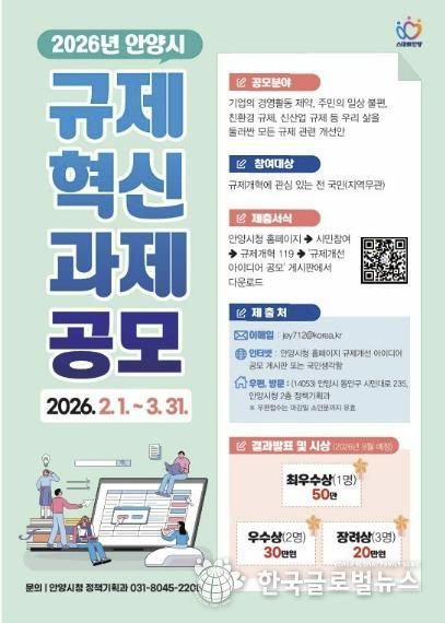 (한국글로벌뉴스 - 박소연 기자) 안양시는 시민이 직접 체감하는 규제혁신을 실현하고 다양한 규제개선 아이디어 발굴을 위해 오는 3월 31일까지‘2026년 안양시 규제혁신 과제 공모’를 진행한다고 2일 밝혔다.