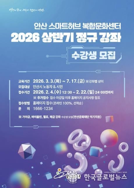 (한국글로벌뉴스 - 박소연 기자) 안산시 스마트허브복합문화센터는 오는 4일부터 상반기 정규강좌 수강생을 모집한다고 3일 밝혔다.