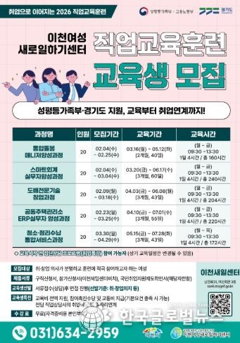 (한국글로벌뉴스 - 박종욱 기자) 이천여성새로일하기센터는 경력 단절 여성의 직업능력 개발과 취·창업 연계를 위해 2026년 직업교육훈련 교육생을 모집한다.