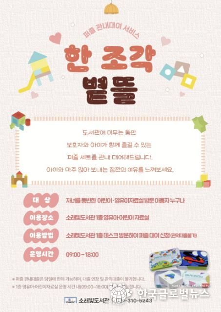 (한국글로벌뉴스 - 박소연 기자) 시흥시 소래빛도서관은 어린이를 위한 관내 퍼즐 대여 서비스 ‘한 조각 볕뜰’을 새롭게 선보인다. 이 서비스는 빠른 영상과 즉각적인 자극에 익숙해진 아이들이 잠시 속도를 늦추고, 손끝 감각과 집중력을 자연스럽게 기를 수 있도록 마련됐다.