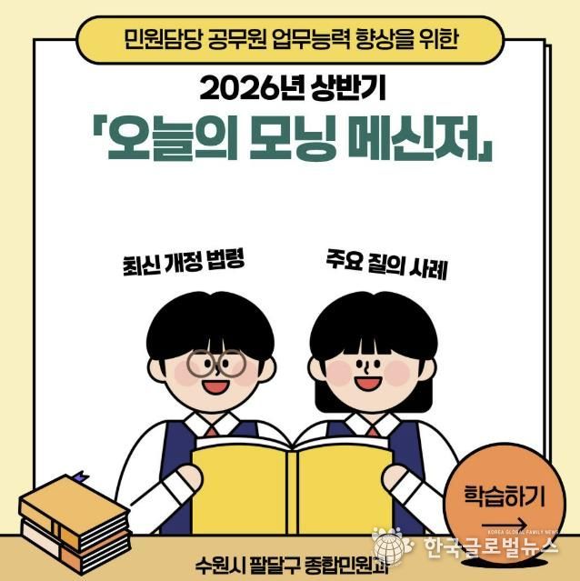 김미라 팔달구 종합민원과장은 “매일 아침 짧은 시간을 투자한 꾸준한 직무 학습이 시민들에게 더욱 정확하고 친절한 행정서비스를 제공하는 밑거름이 될 것”이라며, “앞으로도 직원들의 민원 대응 역량을 강화해 시민이 체감할 수 있는 만족도 높은 구정을 펼쳐 나가겠다”라고 전했다.