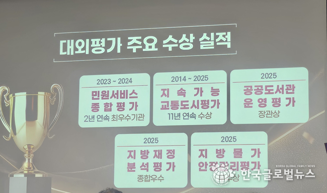 이와 함께 △민원서비스 종합평가 2년 연속 최우수 기관 선정 △지속가능 교통도시평가 11년 연속 수상 △2025년 노인의 날 기념식 노인복지 부문 국무총리상 수상 등 다수의 대외 성과를 거두며 행정의 우수성을 입증했다.