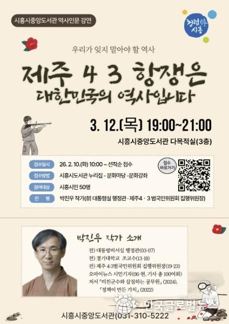 (한국글로벌뉴스 - 박소연 기자) 시흥시중앙도서관은 오는 3월 12일 오후 7시, 시민을 대상으로 역사 인문 강연 ‘제주 4ㆍ3항쟁은 대한민국의 역사입니다’를 운영한다.
