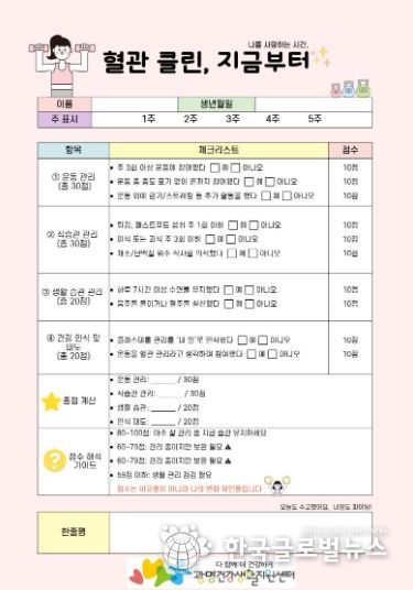 (한국글로벌뉴스 - 박소연 기자) 광명시 광명건강생활지원센터가 시민들의 만성질환 예방과 자가 건강관리 역량 강화를 위해 ‘혈관 클린, 지금부터’ 프로그램을 운영한다.