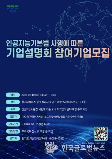 (한국글로벌뉴스 - 박소연 기자) 경기도가 지난 1월 22일 시행된 ‘인공지능 기본법’에 대한 도내 기업들의 이해를 돕기 위해 10일 오후 2시 판교 경기AI캠퍼스에서 AI 기업 대상 설명회를 개최한다.