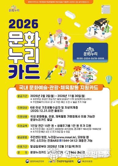 (한국글로벌뉴스 - 박소연 기자) 경기도가 6세 이상 기초생활수급자나 차상위계층의 문화·여행·체육 활동을 지원하기 위해 추진하는 통합문화이용권 ‘문화누리카드’의 지원금이 15만 원으로 전년 대비 1만 원 인상된다.