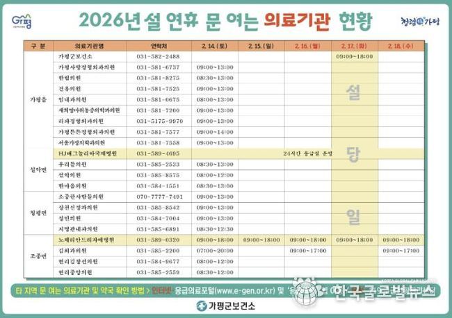 (한국글로벌뉴스 - 박소연 기자) 가평군이 설 연휴 기간 의료 공백 최소화에 나선다. 군은 2월 14일부터 18일까지 이어지는 설 연휴 동안 군민 의료 불편을 최소화하기 위해 응급진료상황실을 설치·운영한다고 밝혔다.