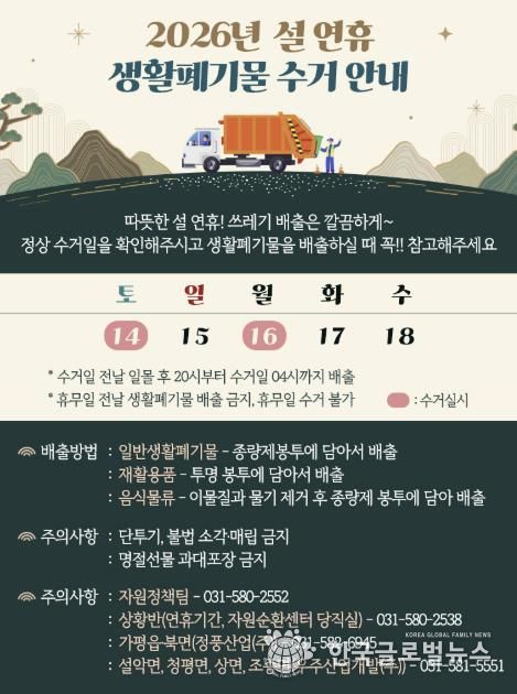 (한국글로벌뉴스 - 박소연 기자) 가평군은 설 명절을 맞아 군민과 방문객 모두가 쾌적한 환경에서 청결한 연휴를 보낼 수 있도록 생활폐기물 처리 대책을 마련했다.