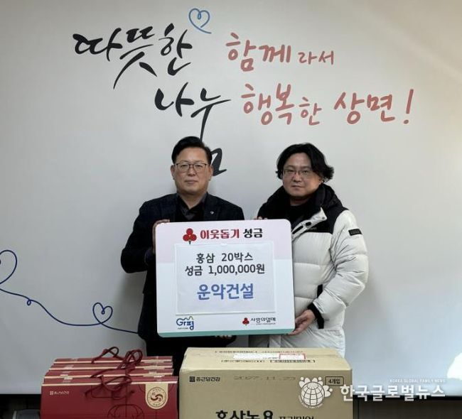 (한국글로벌뉴스 - 박소연 기자) 가평군 소재 운악건설은 최근 설 명절을 맞아 지역 내 취약계층을 돕기 위해 성금 100만 원과 홍삼 20박스를 상면 행정복지센터에 기탁했다.