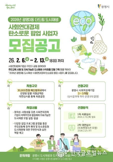 시는 오는 3월부터 12월까지 광명3동 더드림 도시재생사업의 일환인 ‘2026년 광명3동 도시재생-사회연대경제 탄소로운 팝업 사업’을 추진한다고 10일 밝혔다.