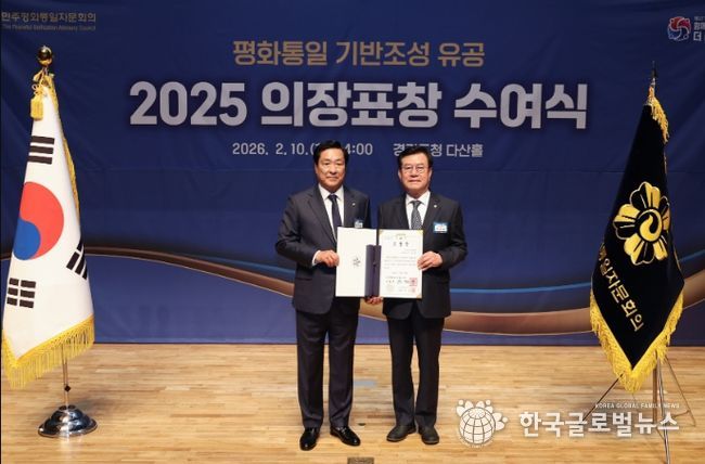 (한국글로벌뉴스 - 박소연 기자) 이상복 오산시의회 의장이 10일 경기도청 다산홀에서 ‘2025년 평화통일 기반 조성 유공 표창’을 받았다.