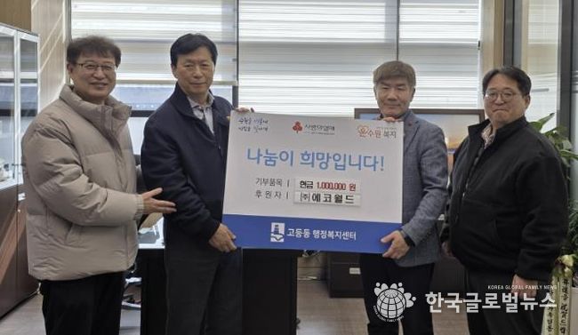 (한국글로벌뉴스 - 박소연 기자) 수원시 팔달구 고등동은 지난 11일, ㈜에코월드에서 고등동 관내 지역주민을 위해 성금 100만원을 기탁했다고 밝혔다.