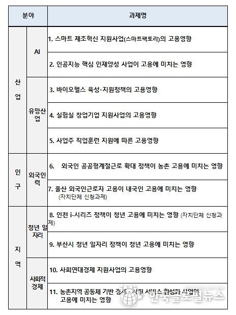 이날 회의에서는 2026년도 평가대상 후보과제에 대해서도 심의가 이뤄졌는데, 그간 고용 및 산업 전문가, 관계부처, 자치단체 등의 의견수렴 등을 거쳐 11개 후보과제가 발굴되었고, AI 등 유망산업분야(5개), 외국인 고용 등 인구구조분야(2개), 청년일자리・사회적 경제 등 지역정책분야(4개) 등 일자리에 영향을 미치는 주요 정책과제들로 확정되었다.
