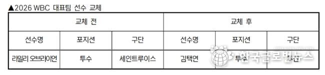 (한국글로벌뉴스 - 박지형 기자) KBO 전력강화위원회는 부상으로 인해 WBC 참가가 어려워진 세인트루이스 라일리 오브라이언을 대체할 선수로 두산 김택연을 확정하고 WBC 조직위에 선수 교체 승인을 요청했다.