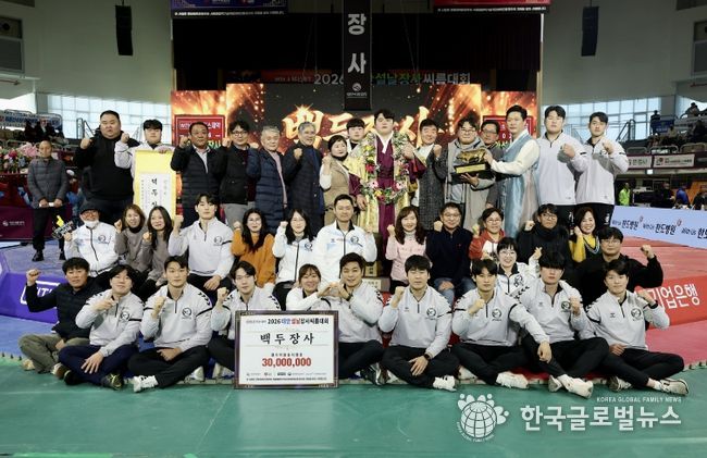 (한국글로벌뉴스 - 박지형 기자) 영암군민속씨름단 김민재 장사가 18일 충남 태안종합실내체육관에서 열린 ‘2026 위더스제약 태안설날장사씨름대회’ 140kg 이하 백두급에서 우승하며 설날장사 타이틀을 거머쥐었다.