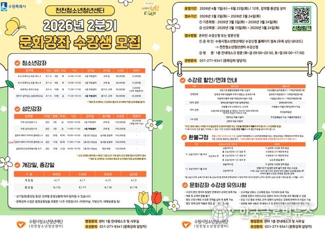 (한국글로벌뉴스 - 박소연 기자) 수원시청소년청년재단 천천청소년청년센터는 지역 청소년 및 성인을 대상으로 하는 2분기 문화강좌 수강생을 모집한다고 밝혔다.