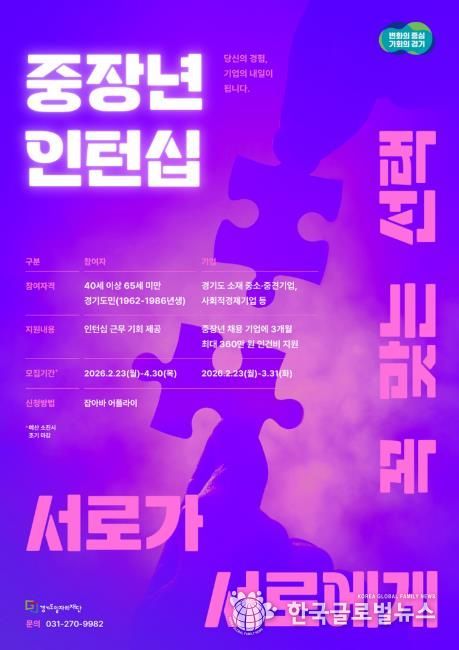 (한국글로벌뉴스 - 박소연 기자) 경기도와 경기도일자리재단은 도내 중장년 구직자에게 일 경험을 제공하고, 기업에는 인건비를 지원하는 ‘중장년 인턴십 사업’ 참여자와 기업을 23일부터 모집한다. 올해는 총 730명의 중장년 도민이 사업에 참여할 수 있다.