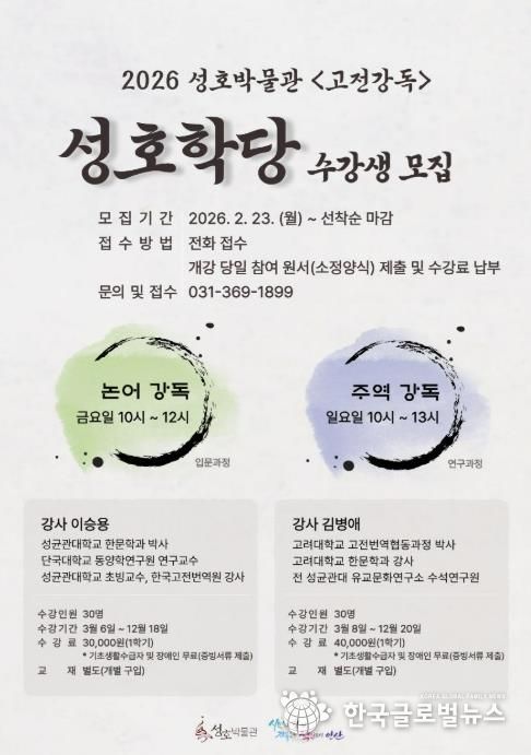 수강 신청은 오는 23일부터 전화로 선착순 접수하며, 자세한 사항은 성호박물관 누리집에서 확인할 수 있다.