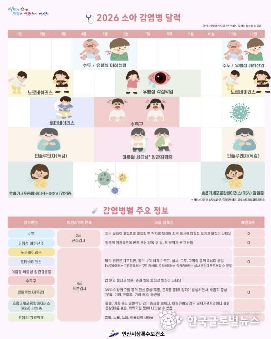 특히 이번에 배포되는 ‘소아 감염병 달력’은 시기별 주요 감염병 정보를 한눈에 확인할 수 있도록 구성됐다. 피부 발진, 고열, 구토 등 주요 증상과 법정 감염병 분류 정보가 상세히 수록돼 있어 현장에서의 조기 발견과 대처에 큰 도움이 될 것으로 기대된다.