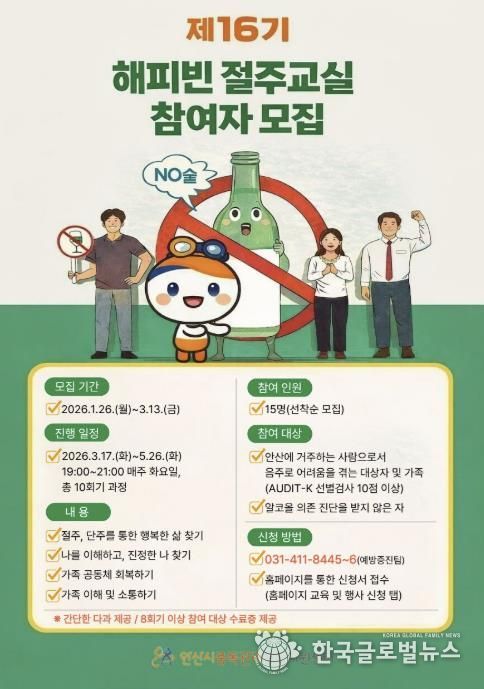 (한국글로벌뉴스 - 박소연 기자) 안산시 중독관리통합지원센터는 내달 13일까지 ‘제16기 해피빈 절주교실’ 참여자를 모집한다고 23일 밝혔다.