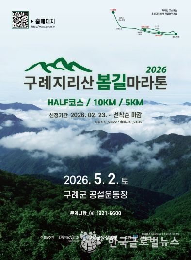 (한국글로벌뉴스 - 박지형 기자) 전남 구례군은 아름다운 자연환경을 배경으로 한 ‘제1회 구례 지리산봄길 마라톤대회’가 오는 5월 2일 구례공설운동장에서 개최된다고 밝혔다.