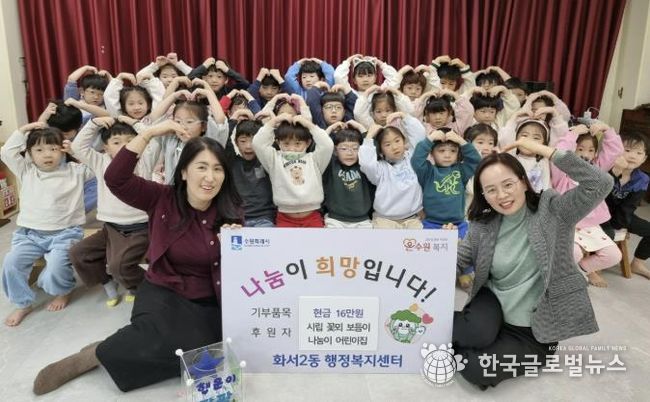 (한국글로벌뉴스 - 박소연 기자) 수원시 팔달구 화서2동 소재 시립꽃뫼보듬이나눔이어린이집은 지난 23일, 원아와 학부모, 교직원이 함께 마련한 바자회 수익금 16만 원을 지역 내 어려운 이웃을 위해 사용해 달라며 화서2동 행정복지센터에 기탁했다.