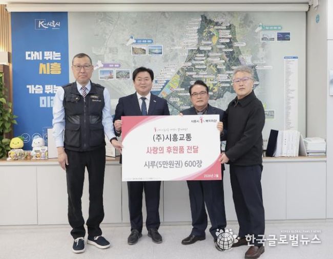 (한국글로벌뉴스 - 박소연 기자) 시흥시는 지난 2월 26일 ㈜시흥교통에서 저소득층 지원을 위해 시루 5만 원권 600여 장을 시흥시1%복지재단에 전달했다고 밝혔다.